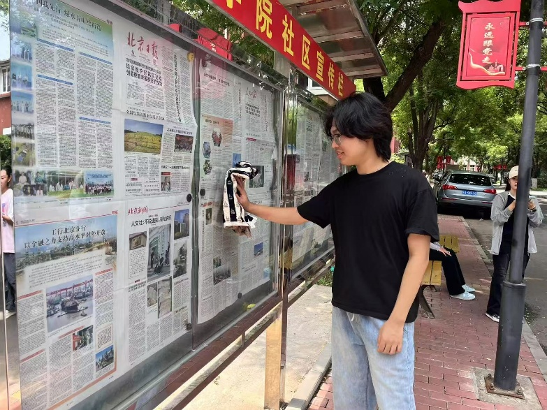 社区内整理停放的自行车、清洁社区公告栏和宣传栏等,沐浴着夏日的阳光和蝉鸣,同学们虽然工作量很大,汗流浃背,却依然乐此不疲。在进行社区调查时也取得了居民的诸多正面反馈。